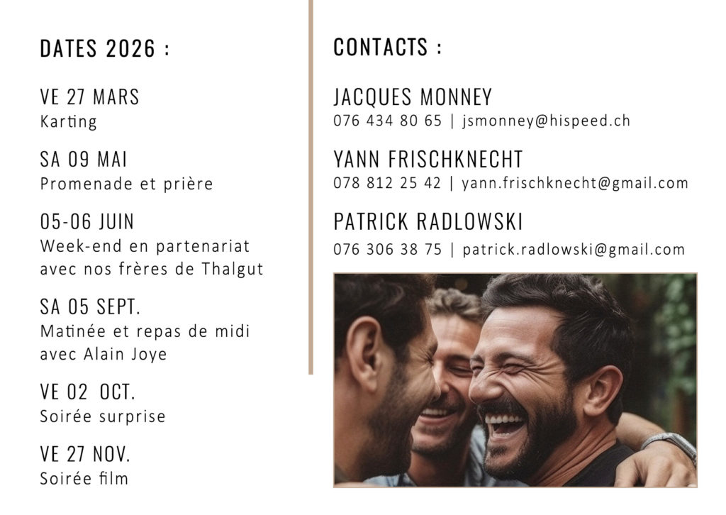 Le groupe des hommes se retrouve environ 6x par année. Autour d’un repas, d’une marche, d’une soirée film ou de soirées After-work. Ces soirées sont parfaites pour apprendre à se connaître, partager entre hommes et grandir dans la communion fraternelle.