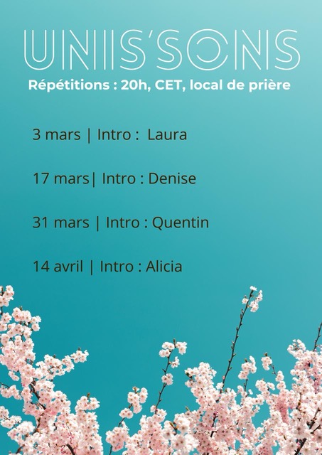 Vous aimez chanter ? Alors bienvenue à la chorale Unis’sons. Répétition les mardis soir à 20h. Possibilité de participer seulement à certain projet.